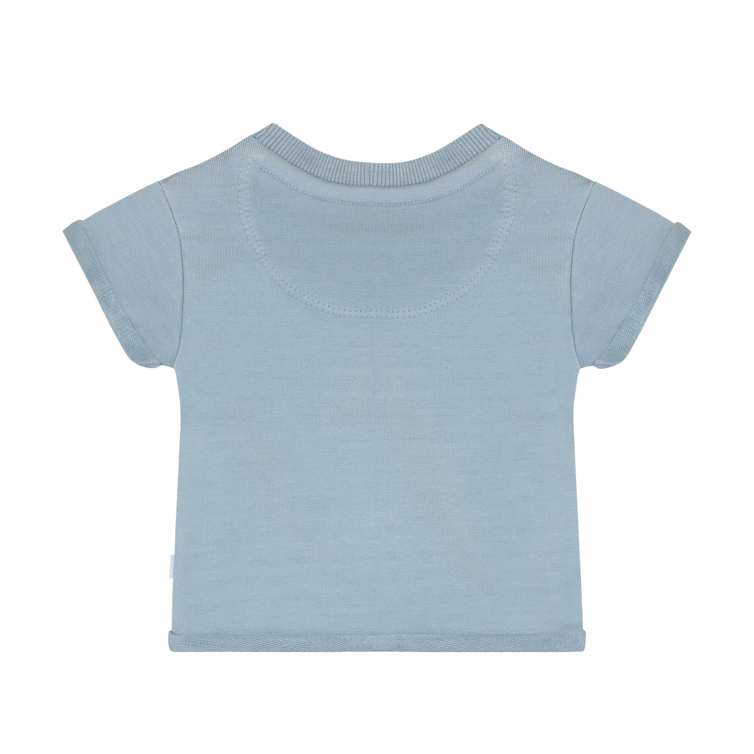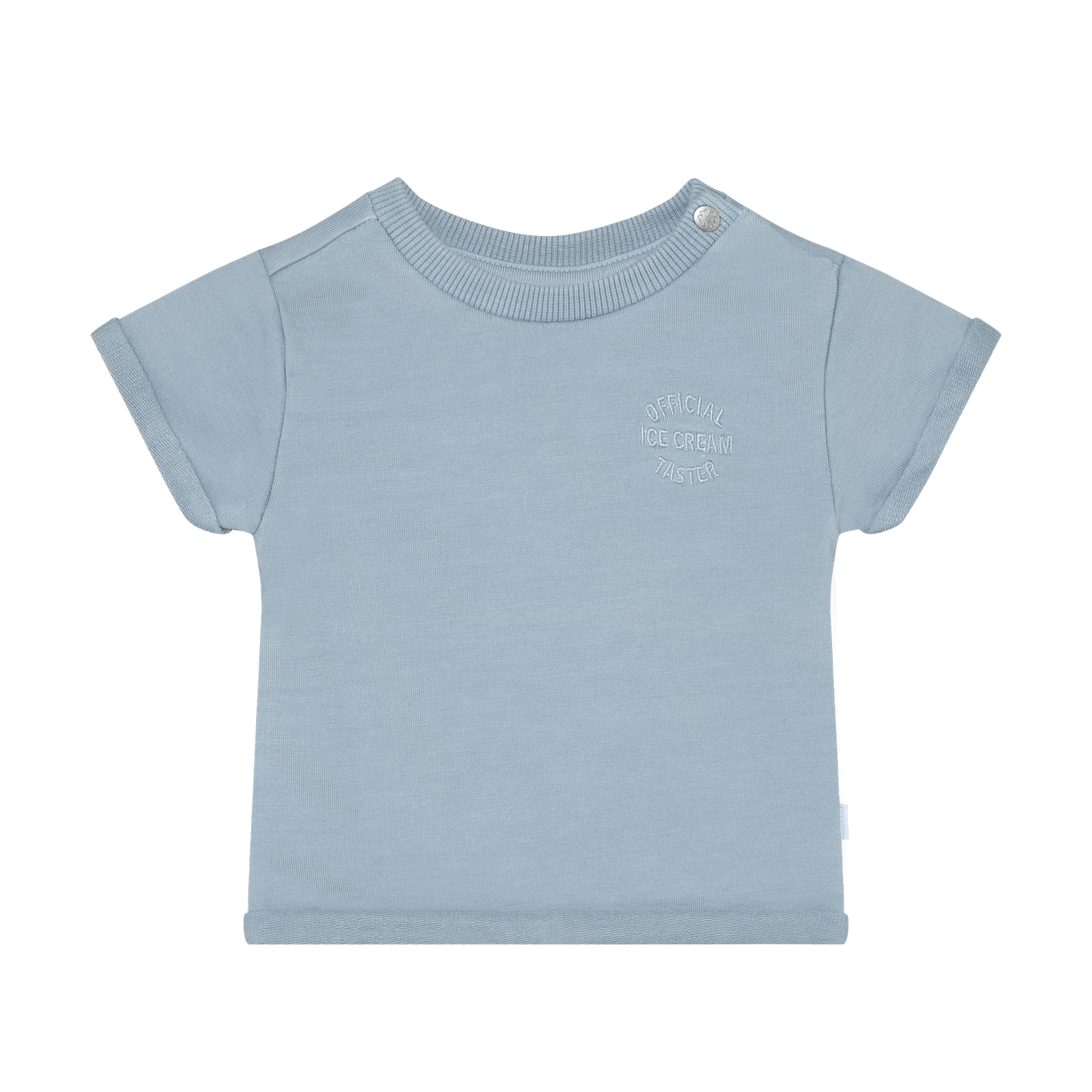 Deze baby top met korte mouwen is gemaakt van zachte french terry met organic katoen en een beetje stretch. De stof voelt comfortabel aan en geeft een iets vollere, zachte uitstraling. De rustige kleur maakt deze baby kleding mooi te combineren met een broekje of shorts.